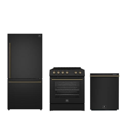 View full detailsForno 3-Piece Appliance Package - 30" Leonardo Espresso Electric Range, Refrigerator, & Dishwasher in Black with Antique Brass Handle, FBDL-007-02US