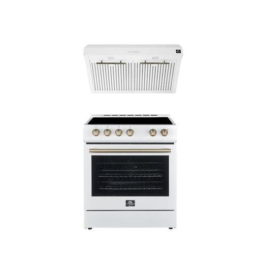 Forno Espresso 2-Piece Appliance Package - 30" Electric Range with 5.0 Cu.Ft. Electric Oven and Under Cabinet Range Hood in White with Antique Brass Trim, FBDL-002-03US
