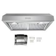 The 48 in. Haven Collection 500 CFM Ducted Under Cabinet Range Hood, Button Control, LED Lights, Stainless Steel delivers professional-grade performance for larger kitchens. This Cosmo under cabinet range hood features dual motors producing 500 CFM of suction, making it ideal for handling multiple burners simultaneously. Crafted from premium 430 grade brushed stainless steel with seamless corners, the COS-QB48 combines durability with a sleek, space-saving profile. The Haven Collection emphasizes enhanced functionality and design, offering convenient push button controls for three fan speeds and bright LED lighting. ARC FLOW permanent stainless steel filters are dishwasher-safe for effortless maintenance. Configured for ducted use, this Cosmo under cabinet range hood can be converted to ductless operation with the separately sold Carbon Filter Kit CFK5. ETL Listed and backed by a 2-year limited warranty, it includes a 3-prong power cord for straightforward installation.