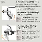 • Revolutionary 10-1/2 in. AcquaFALL Waterfall Jet with 3 Spray Modes – Choose from wide, gentle full-body immersion or targeted sprays for soothing coverage.