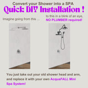 Transform even the smallest bathroom into a spa retreat with the FORNO ACQUA Mini AcquaSPA Shower System. Perfect for apartments, guest baths, or tight spaces, this compact 3-in-1 system includes a patented 6-function rain shower head, a 5-function ergonomic handheld, and the revolutionary 10-1/2 in. AcquaFALL Waterfall Jet for wide or targeted relief. The directional AcquaFALL jet easily suits users of all heights, delivering personalized hydrotherapy for daily relaxation. Designed for quick DIY wall-mounted installation, it blends effortlessly into any layout. Finished in sleek matte black, the Mini AcquaSPA System brings high-performance showering and contemporary design together. Luxury can fit any space.