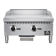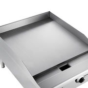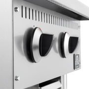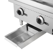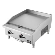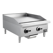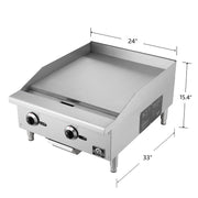 This 24 Inch Commercial Gas Griddle delivers 60,000 BTUs of cooking power with two burners and a heavy duty 1 inch carbon steel griddle plate. Built from durable stainless steel 430, it features a 33-inch depth for a larger cooking area, fully welded splash guards, and a cool to the touch stainless steel front edge. An easy-to-remove 4.5 quart grease drawer with weep hole simplifies cleanup, while adjustable non-skid feet ensure stability. Designed for natural gas with a standing pilot ignition system, this griddle also includes an LP conversion kit for versatile installation in restaurants, diners, and food trucks.