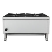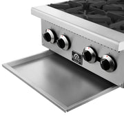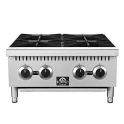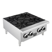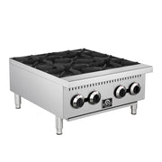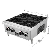 This 24 Inch Commercial Gas Hotplate delivers 100,000 BTUs of powerful heat across four octagonal open burners, ideal for high volume cooking in professional kitchens. Its durable stainless steel 430 body and matte cast iron grates provide long lasting performance, while the standing pilot lights and manual knob controls give precise flame adjustment. Designed for convenience, it features cool to the touch front edges, full-width removable crumb trays, and adjustable stainless steel non-skid feet for stability and easy cleaning. Includes an LP kit for flexible installation.