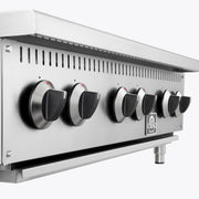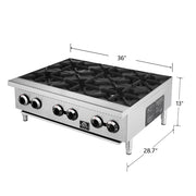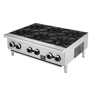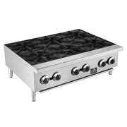 This 36 Inch Commercial Gas Hotplate delivers 150,000 BTUs across six octagonal open burners, perfect for high volume kitchens. Built with durable stainless steel 430 and matte cast iron grates, it ensures long-lasting performance. Each burner features a standing pilot light and manual knob control for precise flame adjustment. Designed for convenience and safety, it includes cool to the touch front edges, full width removable crumb trays, and adjustable non-skid feet. LP kit included for flexible installation.