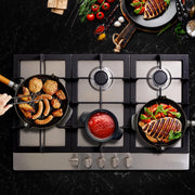 The Cosmo Gas Cooktop, 30" Pro Style Stainless Steel Rangetop delivers professional-grade performance for serious home cooks. This cosmo 30 gas cooktop features five versatile burners ranging from a powerful 16,000 BTU triple ring burner for rapid boiling and searing to a gentle 5,000 BTU auxiliary burner for delicate sauces. The 850SLTX-E model combines styling and manufacturing excellence with practical features like front-mounted controls for safe operation, durable cast iron grates, and an easy-to-clean stainless steel surface. Electronic ignition with flame failure technology ensures safety and efficiency in every use. Whether you're preparing weeknight dinners or gourmet meals, this gas-operated appliance gives you the precise control needed to cook like a professional chef. Compatible with natural gas and propane (LP kit sold separately), it installs easily with a standard 3-prong power plug.