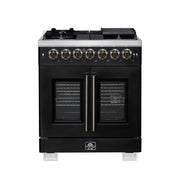 Forno Capriasca 30" Freestanding French Door Dual Fuel Range in Black with 5 Brass Burners, Air Fryer Kit, Rotisserie Kit, Wok Support & Griddle in Black with Antique Brass Accents, FFSGS6387-30BLK