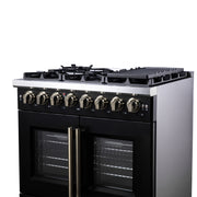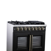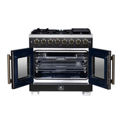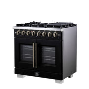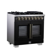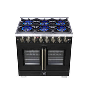 Forno Capriasca 36" 5.36 cu. ft. Dual Fuel Range with 6 Brass Burners, Air Fryer Kit, Rotisserie Kit, Wok Support & Griddle in Black with Antique Brass Handles, FFSGS6387-36BLK