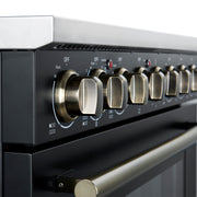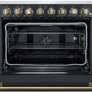 The Forno Paolo 36 Inch Black Freestanding Electric Range combines professional-grade performance with timeless design. This forno 36 electric range (FFSEL6011-36BLK) features a sleek black finish accented by elegant antique brass knobs and handles. Its smooth ceramic glass cooktop houses six radiant elements delivering 9,800 watts of total power, from a gentle 100-watt warming zone to a robust 3,300-watt burner. The spacious 5.44 cu.ft. true European convection oven ensures even baking and roasting with a 1,200-watt fan element, while the dual-element broiler provides 3,000 watts for precise high-heat cooking. A hidden bake element simplifies cleanup, and bright halogen lighting with a large viewing window lets you monitor dishes without heat loss. Two adjustable racks maximize cooking space, making this Forno Paolo range ideal for home chefs who demand both style and exceptional performance in their modern kitchen.