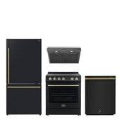 Forno 4-Piece Appliance Package- 30" Electric Range, Under Cabinet Range Hood, 31" Refrigerator, and Built-In Dishwasher in Black with Antique Brass Trim, FBDL-006-02US