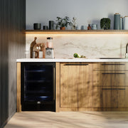 The Forno Frescolino 24 Inch Black Beverage Cooler with Antique Brass Handles is the ideal 24 inch beverage cooler for any kitchen, home bar, or entertainment area. Designed for both built-in and freestanding installation, this beverage refrigerator holds up to 188 standard cans with adjustable shelving to accommodate various bottle and can sizes. The triple-layer anti-UV glass door protects your drinks from light damage while the fingerprint-resistant black finish keeps maintenance simple. Touch controls allow you to easily switch between Celsius and Fahrenheit, while LED lighting beautifully illuminates your collection. The embossed galvanized steel cabinet ensures long-term durability, and the constant frequency compressor with charcoal filters provides quiet, consistent cooling. Whether you're outfitting a modern kitchen or a classic bar setup, this beverage fridge combines vintage-inspired design with reliable performance.