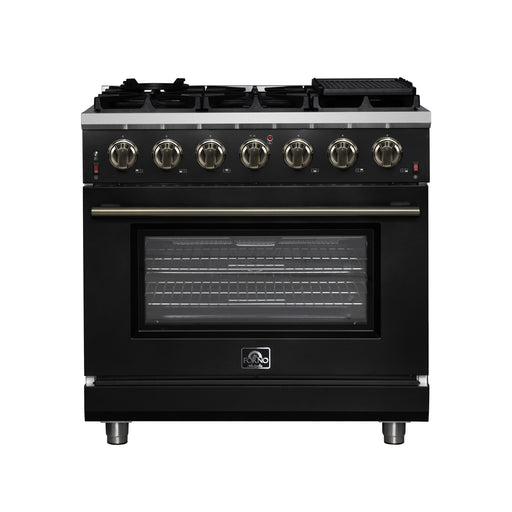Forno Massimo 36" 5.36 cu. ft. Freestanding Gas Range with 6 Sealed Burners, Air Fryer Kit, Wok Support & Griddle in Black with Antique Brass Accents, FFSGS6239-36BLK