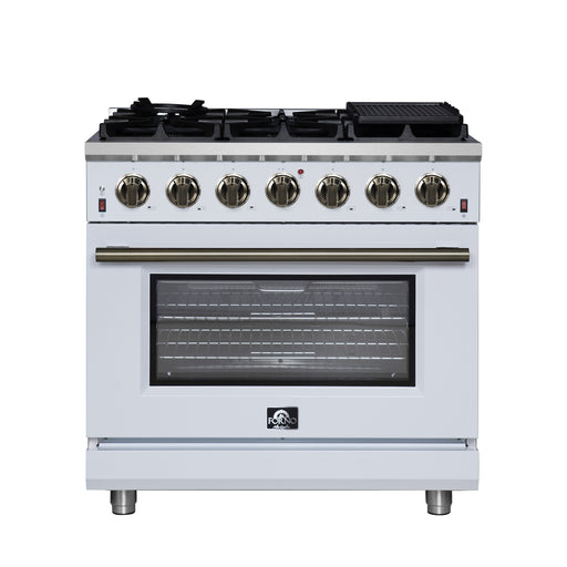 Forno Massimo 36" Freestanding Gas Range in White, 6 Burners, Air Fry, Convection Fan, with Antique Brass Handles, FFSGS6239-36WHT