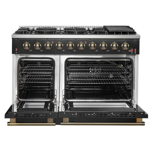 Forno Galiano 48" Freestanding Gas Range in Black, Double Oven, 8 Burners, Griddle, with Antique Brass Handles, FFSGS6244-48BLK
