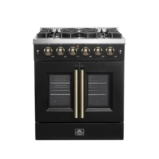Forno Galiano 30" Freestanding French Door Gas Range in Black, 5 Burners, Convection Oven, with Antique Brass Handles, FFSGS6444-30BLK