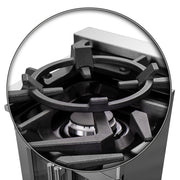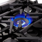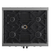 • Heavy-Duty Continuous Cast Iron Grates – Ensure even heat distribution, cookware stability, and seamless mobility across the deep recessed black enamel rangetop that contains spills.