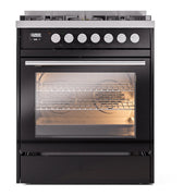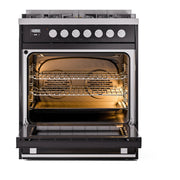 Introducing the new ILVE 30 dual fuel range, a combination of professional style and innovative functionality to elevate your kitchen. This range features sealed burners equipped with total black brass burners with non-stick nanotechnological coating, 4 cu. ft. dual oven capacity and soft closing door system.