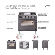 Introducing the new ILVE Professional Plus II 36 dual fuel range, a combination of professional style and innovative functionality to elevate your kitchen. This ilve 36 dual fuel range features sealed burners equipped with total black brass burners with non-stick nanotechnological coating, 3.5 cu. ft. dual oven capacity, and soft closing door system.