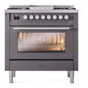 Introducing the new ilve 36 dual fuel range, a combination of professional style and innovative functionality to elevate your kitchen. This range features sealed burners equipped with total black brass burners with non-stick nanotechnological coating, 3.5 cu. ft. dual oven capacity, and a soft closing door system, making it an ideal centerpiece for any modern cooking space.