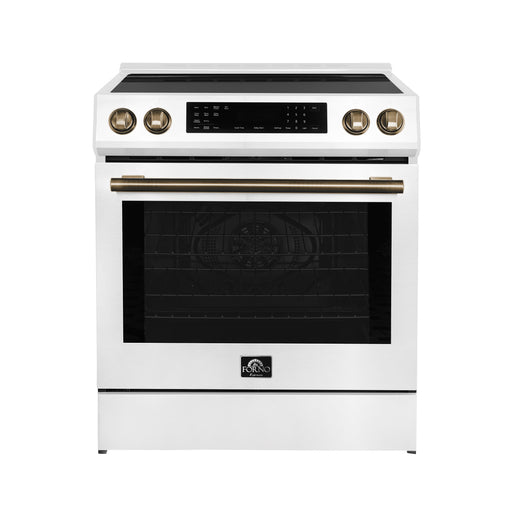 View full detailsForno Donatello Espresso 30" Freestanding Induction Range in White, True Convection, Air Fry, with Antique Brass Handles, FFSIN0905-30WHT