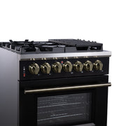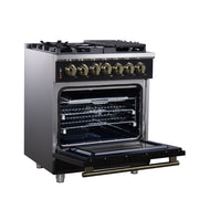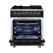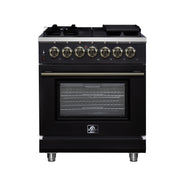 Forno Massimo 30" Freestanding Dual Fuel Range in Black with 5 Sealed Burners, Air Fryer Kit, Wok Support & Griddle in Black with Antique Brass Accents, FFSGS6125-30BLK