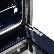 The Massimo 30 Inch Dual Fuel Range in Black with Antique Brass Accessories delivers professional-grade performance in a compact footprint. This 30 inch dual fuel range combines the precision of gas burners with the even heating of a true electric convection oven, making it ideal for serious home cooks. The freestanding gas range features four sealed burners, matte cast iron grates, and versatile accessories including a wok ring and removable griddle. The spacious 4.32 cu. ft. convection oven offers multiple cooking modes including low bake, high bake, and convection broiling, plus an air fryer basket for healthier meal options. With its striking black finish, antique brass handles and trim, and speckled blue enamel oven cavity, this dual fuel range adds both style and functionality to any kitchen. LP convertible with included kit for flexible installation.