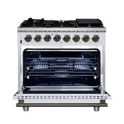 Forno Massimo 36" 5.36 cu. ft. Freestanding Dual Fuel Range with 6 Sealed Burners, Air Fryer Kit, Wok Support & Griddle in Black with Antique Brass Accents, FFSGS6125-36WHT