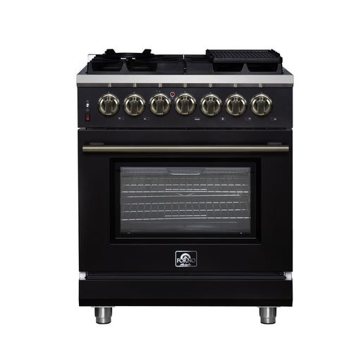View full detailsForno Massimo 30" Freestanding Dual Fuel Range in Black with 5 Sealed Burners, Air Fryer Kit, Wok Support & Griddle in Black with Antique Brass Accents, FFSGS6125-30BLK