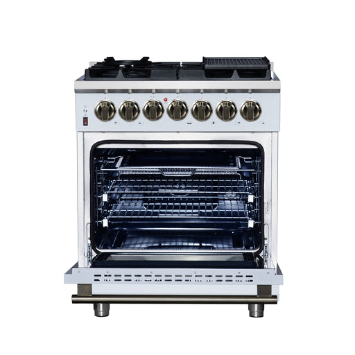 View full detailsForno Massimo 30" Freestanding Dual Fuel Range in White with 5 Sealed Burners, Air Fryer Kit, Wok Support & Griddle in White with Antique Brass Accents, FFSGS6125-30WHT