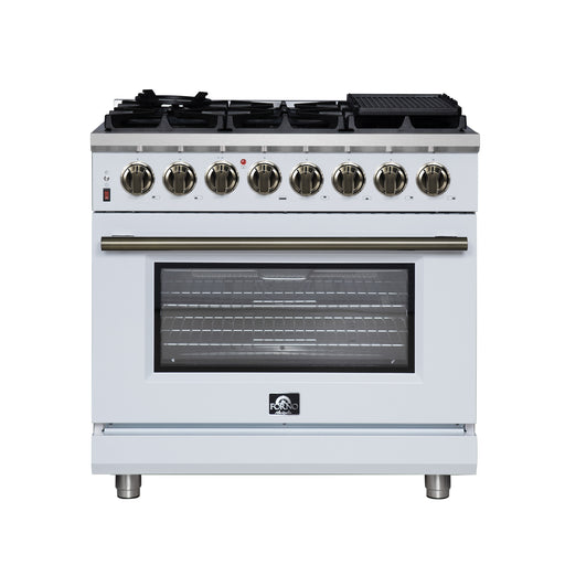 View full detailsForno Massimo 36" 5.36 cu. ft. Freestanding Dual Fuel Range with 6 Sealed Burners, Air Fryer Kit, Wok Support & Griddle in White with Antique Brass Accents, FFSGS6125-36BLK