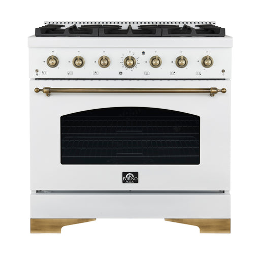 View full detailsForno Antico 36" Freestanding Dual Fuel Range in White, Brass Burners, 6 Burners, with Antique Brass Handles, FFSGS6113-36WHT
