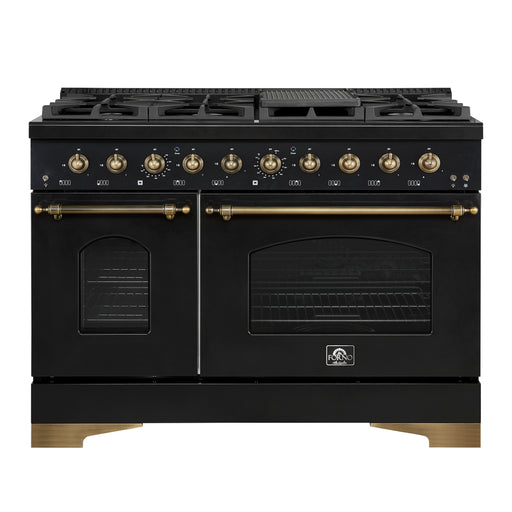 View full detailsForno Antico 48" Freestanding Dual Fuel Range in Black, Double Oven, 8 Burners, with Antique Brass Handles, FFSGS6113-48BLK