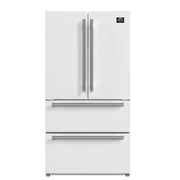 The Forno Moena 36-inch Freestanding French Door Refrigerator in White delivers exceptional performance and elegant style for modern kitchens. This 36 inch french door refrigerator features a counter depth design that integrates seamlessly with cabinetry while offering 19.2 cubic feet of storage. The fresh food compartment includes three glass shelves, six door bins, and two drawers for versatile organization, while the freezer provides two pull-out drawers and a slide-out tray. Frost-free multi-airflow cooling maintains consistent temperatures throughout, and the inverter compressor ensures quiet, energy-efficient operation. The automatic ice maker produces up to 4 pounds daily, and see-through drawers offer instant visibility. With antique brass and stainless steel handle options, LED touch controls, and ENERGY STAR certification, this white french door refrigerator combines premium functionality with sophisticated design for discerning homeowners.