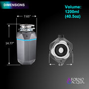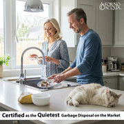 The FORNO ACQUA BrightDIAMOND Black Onyx 3/4HP Super Quiet Garbage Disposal transforms your kitchen with cutting-edge technology and premium craftsmanship. This super quiet garbage disposal features a powerful permanent magnet motor that delivers efficient grinding while maintaining whisper-silent operation. The exclusive BrightDIAMOND motion sensor cabinet light adds a touch of brilliance with its 270-degree cool blue LED illumination, making kitchen tasks easier and more enjoyable. Built with a hardened stainless steel chamber and blades, this corded garbage disposal handles tough food waste effortlessly. The silver ion infused upper chamber eliminates bacteria and odors, while the fire retardant diamond housing ensures enhanced safety. With a pre-wired air switch and plug-in cord, installation is straightforward and safe. The dynamic splash guard and CSA-tested noise suppression design make this the ideal choice for homeowners seeking performance, durability, and sophisticated style in their kitchen.