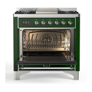 The ilve majestic 36 dual fuel range combines the classic Italian style and cutting-edge technology. This range features 6 gas burners and a griddle, equipped with total black brass burners with non-stick nanotechnological coating, 3.5 cu. ft. total oven capacity, a 4.3 full touch oven control display, and an easy clean enamel oven cavity.