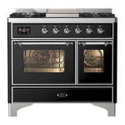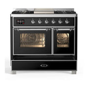 The ILVE Majestic 40 dual fuel range combines the classic Italian style and cutting-edge technology. This range features 6 gas burners and a griddle, equipped with total black brass burners with non-stick nanotechnological coating, dual 2.3 + 1.52 cu. ft. total oven capacity, a 4.3 full touch oven control display, and easy clean enamel oven cavity.