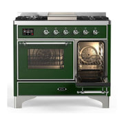 The ilve majestic 40 dual fuel range combines the classic Italian style and cutting-edge technology. This range features 6 gas burners and griddle, equipped with a total black brass burner with non-stick nanotechnological coating, dual 2.3 + 1.52 cu. ft. total oven capacity, 4.3 full touch oven control display and easy clean enamel oven cavity.