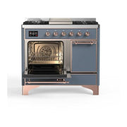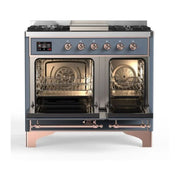 The ilve majestic 40 dual fuel range combines classic Italian style with cutting-edge technology, featuring 6 gas burners and a griddle equipped with total black brass burners that include a non-stick nanotechnological coating. It offers dual ovens with a total capacity of 2.3 + 1.52 cu. ft., a 4.3-inch full touch oven control display, and an easy clean enamel oven cavity for effortless maintenance and superior performance in your kitchen.