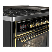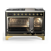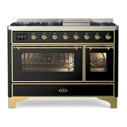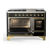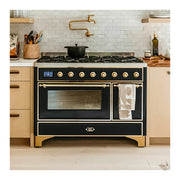 The ilve majestic 48 dual fuel range combines the classic Italian style and cutting-edge technology. This range features 8 gas burners and a griddle, equipped with total black brass burners with non-stick nanotechnological coating, dual 3.5 + 1.52 cu. ft. total oven capacity, a 4.3 full touch oven control display, and easy clean enamel oven cavity.