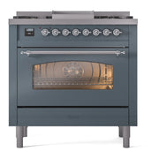 Introducing the new Nostalgie II 36 dual fuel range, a classic addition with a touch of innovation to any kitchen. The ilve nostalgie range 36 features sealed burners equipped with total black brass burners that have a non-stick nanotechnological coating, heavy cast iron grates, 3.5 cu. ft. total oven capacity, and a soft closing door system.