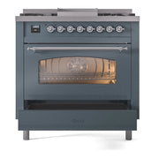 Introducing the new ILVE Nostalgie range 36 dual fuel range, a classic addition with a touch of innovation to any kitchen. This range features sealed burners equipped with total black brass burners that have a non-stick nanotechnological coating, heavy cast iron grates, 3.5 cu. ft. total oven capacity, and a soft closing door system.