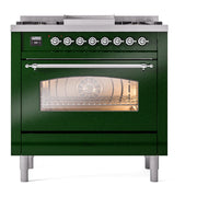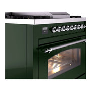 Introducing the new ILVE Nostalgie Range 36, a classic addition with a touch of innovation to any kitchen. This dual fuel range features sealed burners equipped with total black brass burners that have a non-stick nanotechnological coating, heavy cast iron grates, 3.5 cu. ft. total oven capacity, and a soft closing door system, blending timeless style with modern performance.