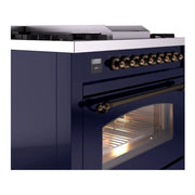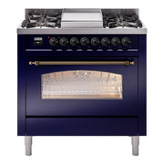 Introducing the new Nostalgie II 36 dual fuel range, a classic addition with a touch of innovation to any kitchen. The ilve nostalgie range 36 features sealed burners equipped with total black brass burners that have a non-stick nanotechnological coating, heavy cast iron grates, 3.5 cu. ft. total oven capacity, and a soft closing door system.