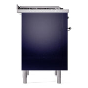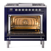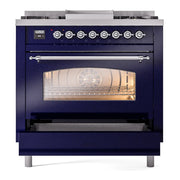 Introducing the new ilve nostalgie range 36, a classic addition with a touch of innovation to any kitchen. This dual fuel range features sealed burners equipped with total black brass burners that have a non-stick nanotechnological coating, heavy cast iron grates, 3.5 cu. ft. total oven capacity, and a soft closing door system.