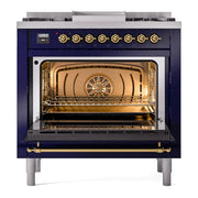 Introducing the new ILVE Nostalgie Range 36 dual fuel range, a classic addition with a touch of innovation to any kitchen. This range features sealed burners equipped with total black brass burners that have a non-stick nanotechnological coating, heavy cast iron grates, 3.5 cu. ft. total oven capacity and soft closing door system.