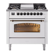 Introducing the new ilve nostalgie range 36 dual fuel range, a classic addition with a touch of innovation to any kitchen. This range features sealed burners equipped with total black brass burners that have a non-stick nanotechnological coating, heavy cast iron grates, 3.5 cu. ft. total oven capacity and soft closing door system.