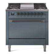 Introducing the new ilve nostalgie range 36 dual fuel range, a classic addition with a touch of innovation to any kitchen. This range features sealed burners equipped with total black brass burners that have a non-stick nanotechnological coating, heavy cast iron grates, 3.5 cu. ft. total oven capacity and soft closing door system.