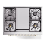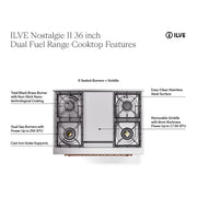 Introducing the new ilve nostalgie range 36, a classic addition with a touch of innovation to any kitchen. This dual fuel range features sealed burners equipped with total black brass burners that have a non-stick nanotechnological coating, heavy cast iron grates, 3.5 cu. ft. total oven capacity, and a soft closing door system.