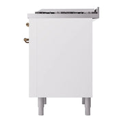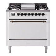 Introducing the ILVE Nostalgie range 36, the new Nostalgie II 36 dual fuel range, a classic addition with a touch of innovation to any kitchen. This range features sealed burners equipped with total black brass burners that have a non-stick nanotechnological coating, heavy cast iron grates, 3.5 cu. ft. total oven capacity, and a soft closing door system.