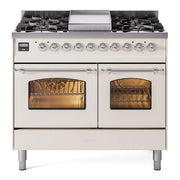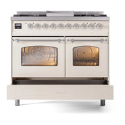 Introducing the new ILVE 40 inch range Nostalgie, a classic addition with a touch of innovation to any kitchen. This range features sealed burners equipped with total black brass burners that have a non-stick nanotechnological coating, heavy cast iron grates, 2.3 + 2 cu. ft. dual oven capacity, and a soft closing door system.
