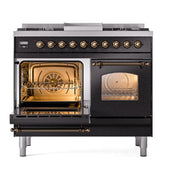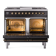 Discover the ILVE 40 inch range Nostalgie II, a dual fuel range that brings a classic addition with a touch of innovation to any kitchen. This exceptional range features sealed burners equipped with Total Black brass burners that have a non-stick nanotechnological coating, heavy cast iron grates, 2.3 + 2 cu. ft. dual oven capacity, and a soft closing door system for effortless operation.